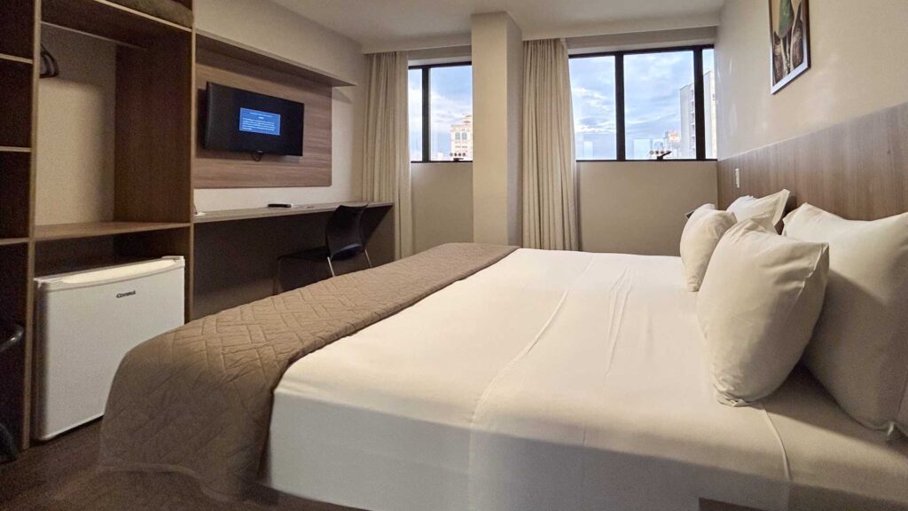 As acomodações do hotel são simples, mas confortáveis, com destaque para as suítes que contam com ar-condicionado, TV a cabo e wifi gratuito. A decoração é clean e funcional, sem frescura.