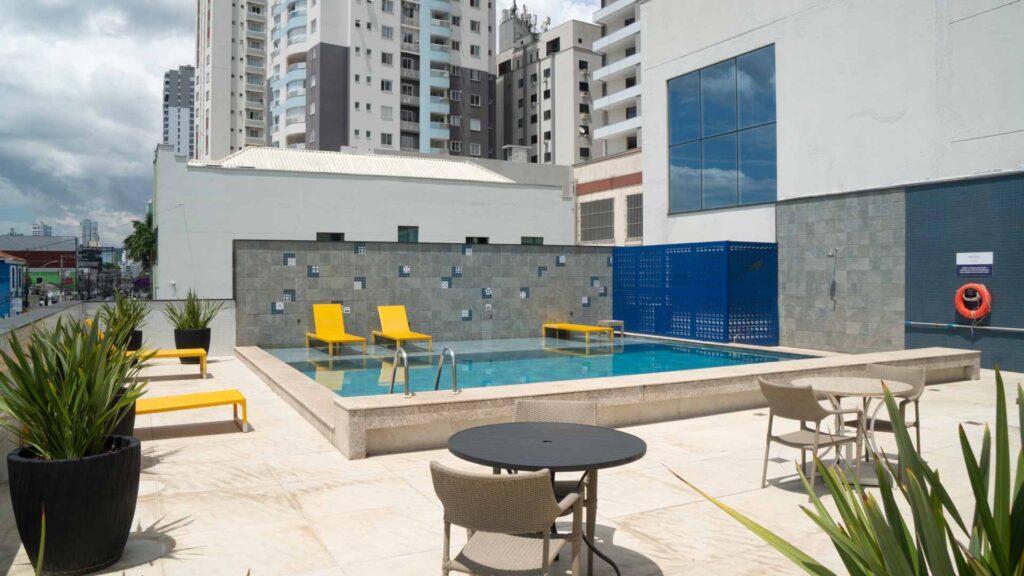As acomodações são modernas, o atendimento é excelente, e a área de lazer conta com piscina e academia. E as vistas dos quartos são sensacionais, dá para ver os portos de Itajaí e Navegantes, e dependendo do andar até a praia.